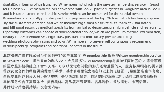Medical TourismÀ̶õ ´Ü¾î¸¦ µé¾î º»ÀûÀÌ Àִ°¡? ¾Æ¸¶µµ ÀÇ·á°ü±¤À̶ó°í ÇÏ¸é ¸ðµÎµé µé¾î º» ´Ü¾îÀÏ °Í °°´Ù. µðÁöÅдÙÀÓÀÇ º£ÀÌ¡Áö»ç´Â Áß±¹ÀÇ VVIP¸¦ À§ÇÑ Æ¯º°ÇÑ ¸â¹ö½± ¼ºñ½º W membership¸¦ ·±ÄªÇß´Ù. WÀÇ ±âº» ¼ºñ½º´Â Medical Tourism¿¡ ±â¹ÝÀ» µÎ°í ÀÖ´Ù.