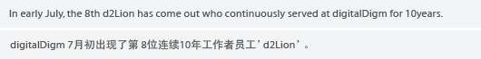µðÁöÅдÙÀÓ¿¡¼´Â Áö³ 7¿ù ÃÊ 8¹øÂ° ¡®µðÅõ¸®¾ð¡¯ ÀÌ (10³â ±Ù¼ÓÀÚ) ź»ý µÇ¾ú´Ù. ±× ¿µ±¤ÀÇ ÁÖÀΰøÀº DM3 PartÀÇ ¹éÂùÈ£ ºÎÀåÀÌ´Ù. ¹éÂùÈ£ ºÎÀå¿¡°Ô´Â µðÅõ¸®¾ð d2Lion ÀÇ ½Éº¼ÀÌ »õ°ÜÁø °¨»çÆÐ¿Í µðÁöÅдÙÀÓÀÇ Áö»ç°¡ ÀÖ´Â Áß±¹ º£ÀÌ¡ ¿©Çà±Ç ¹× Æ÷»ó ÈÞ°¡°¡ ÁÖ¾îÁ³À¸¸ç, ¶ÇÇÑ ±×ÀÇ 10³â°£ ȸ»ç»ýȰ »çÁøÀ» ½ºÅ丮ÅÚ¸µ Çü½Ä ½½¶óÀ̵å·Î º¸¿©ÁÖ´Â µî 10³âÀÇ ³ë°í¸¦ ÃàÇÏÇÏ¿´´Ù. ÇÑÆí ¹éÂùÈ£ ºÎÀåÀº °¨»çÀÇ Àλç¿Í ÇÔ²² 10³â ±Ù¼ÓÀ» ¸ÂÀÌÇÑ ¼Ò°¨À» ÀüÇÏ¸ç ±â»ÝÀ» ÇÔ²² ³ª´©¾ú´Ù.