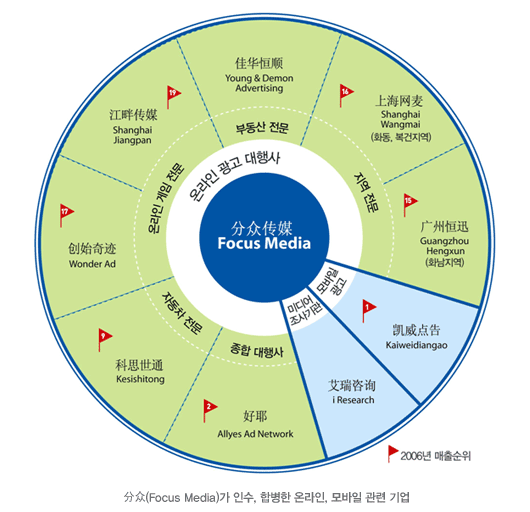 ķ ⼼ ¶ΰ (Wonder Ad), (Shanghai Jianpan), ڵ Ρ(Kesishitong), (Young & Demon Advertising ε ), ȭ (Shanghai Wangmai), ȭ (G uangzhou Hengxun) ¶ (߱ ¶α ü) μ ߱ ¶ ǥ ڸҴ. ߱ ִ ͳ (iResearch) μ (Focus Media) ͳ پ 縦 ϴµ ū ° ִ. Ư ¶ μ 2007, װ͵ ̷ ٴ ǿ ָ ʿ䰡 ִ. Ƹ ڿ ʾ ϴ ̴. (ó μ ߿ ִ ̾߱ Ÿ ִµ, ¶ΰ (Wonder Ad) պ ̱ Omnicom ġ ߴٰ Ѵ. μ ߴ ˷ , Omnicom캸 ļ μ ߰, Ĺ ϸ Omnicom 2000 ߴٰ Ѵ.)
