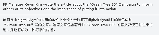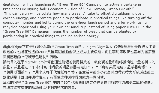 µðÁöÅдÙÀÓÀº ±×¸°Ä·ÆäÀÎ ¡®Green Tree 80¡¯À» ÁøÇàÇϰí ÀÖ´Ù. À̹ø ±×¸°Ä·ÆäÀÎÀº Áö³ 2008 G8 È®´ë Á¤»óȸÀÇ¿¡¼ ÁÖ¿ä ÀÇÁ¦·Î ´Ù·ç¾îÁö°í, À̸í¹Ú Á¤ºÎÀÇ ±¹°¡ºñÀüÀ¸·Î ¼±Æ÷µÇ´Â µî ÃÖ±Ù Àü ¼¼°èÀûÀÎ À̽´·Î ¶°¿À¸£°í ÀÖ´Â ¡®Àúź¼Ò³ì»ý¼ºÀ塯 ¿¡ Àû±Ø µ¿ÂüÇÏ´Â °ÍÀÌ´Ù. |