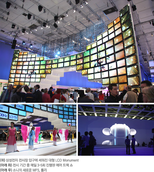 »ï¼ºÀüÀÚ´Â Àü½Ã°ü ÀÔ±¸¿¡ 172°³ÀÇ LCD TV·Î ±¸¼ºµÈ ´ëÇü Á¶Çü¹°À» ¼¼¿ì°í ¸ÖƼ½ºÅ©¸°À» ÅëÇØ LCD TVÀÇ µðÀÚÀÎ ÄÁ¼ÁÀÎ ¡®Crystal Design Story¡¯ µ¿¿µ»óÀ» ¹Ýº¹ »ó¿µÇß´Ù. ½Ç·Î ¹æ¹®°´µéÀÌ ¾Ðµµ´çÇÒ Á¤µµ·Î ¿õÀåÇÑ Á¶Çü¹°À̾ú´Ù. ÀÌ ´ëÇü Á¶Çü¹°À» ¹è°æÀ¸·Î ÀÏ 3~5ȸ, 7ºÐ °¡·®ÀÇ ¿¡¾î Æ®·¢ Air Track ¼î¸¦ ÁøÇàÇØ ¾ð·Ð°ú ¹æ¹®°´µé·ÎºÎÅÍ È£ÆòÀ» ³Ñ¾î¼± Âù»ç¸¦ ¾ò¾ú´Ù. ÀϺΠ°ü¶÷°´µéÀº °ø¿¬ ½Ã°£´ë¸¦ ÆÄ¾ÇÇÑ ÈÄ ¹Ì¸® ÀÚ¸®¸¦ È®º¸ÇÏ°í ±â´Ù¸®´Â ÁøÇ³°æÀ» ¿¬ÃâÇϱ⵵ Çß´Ù.